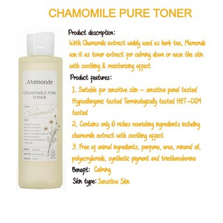 chamomile 25ml mamonde Cn bng pH da, lm du v cn bng m da, gip b mt da lun duy tr trng thi mn mt nh ph sng, Sn phm khng cha cc cht tng hp v cn nn khng gy kh da hoc kch ng. *Claim shop voucher during checkout to enjoy discounted price. Benefit: Oil control