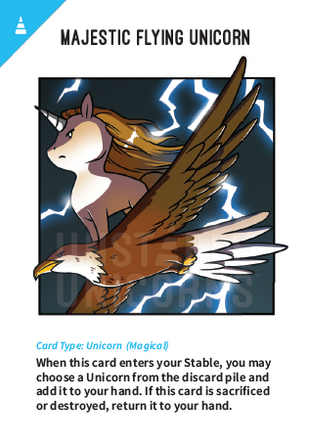 Card Type: Instant DISCARD the card in the Effect Chamber. Base. If this card is in the Hunting Grounds at the end of the game, you lose 1 point. When this card enters your Stable, you may choose a Unicorn card from the discard pile and add it to your hand. If this card would be sacrificed or destroyed, return it to your hand instead. BASIC Unicorn BASIC Unicorn BASIC Unicorn BASIC Unicorn Card Type: Unicorn (Basic) Card Type: Unicorn (Basic) Card Type: Unicorn (Basic) Card Type: Unicorn (Basic) If this card is in the Hunting Grounds at the end of the game, you lose 1 point.